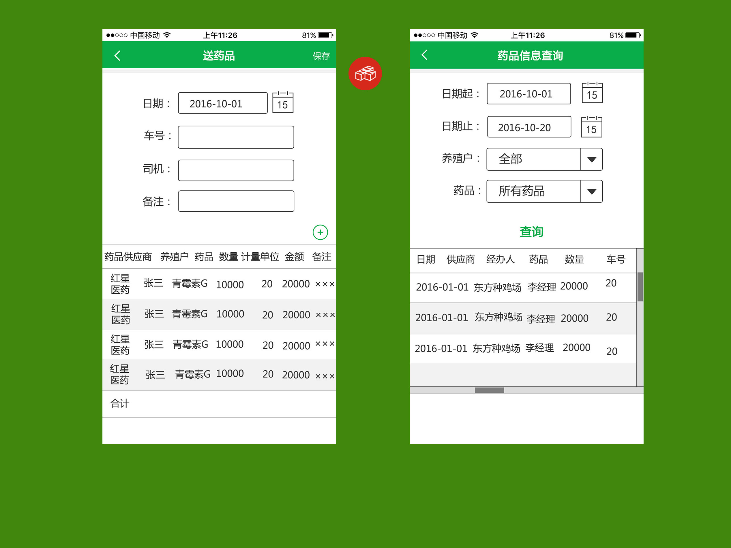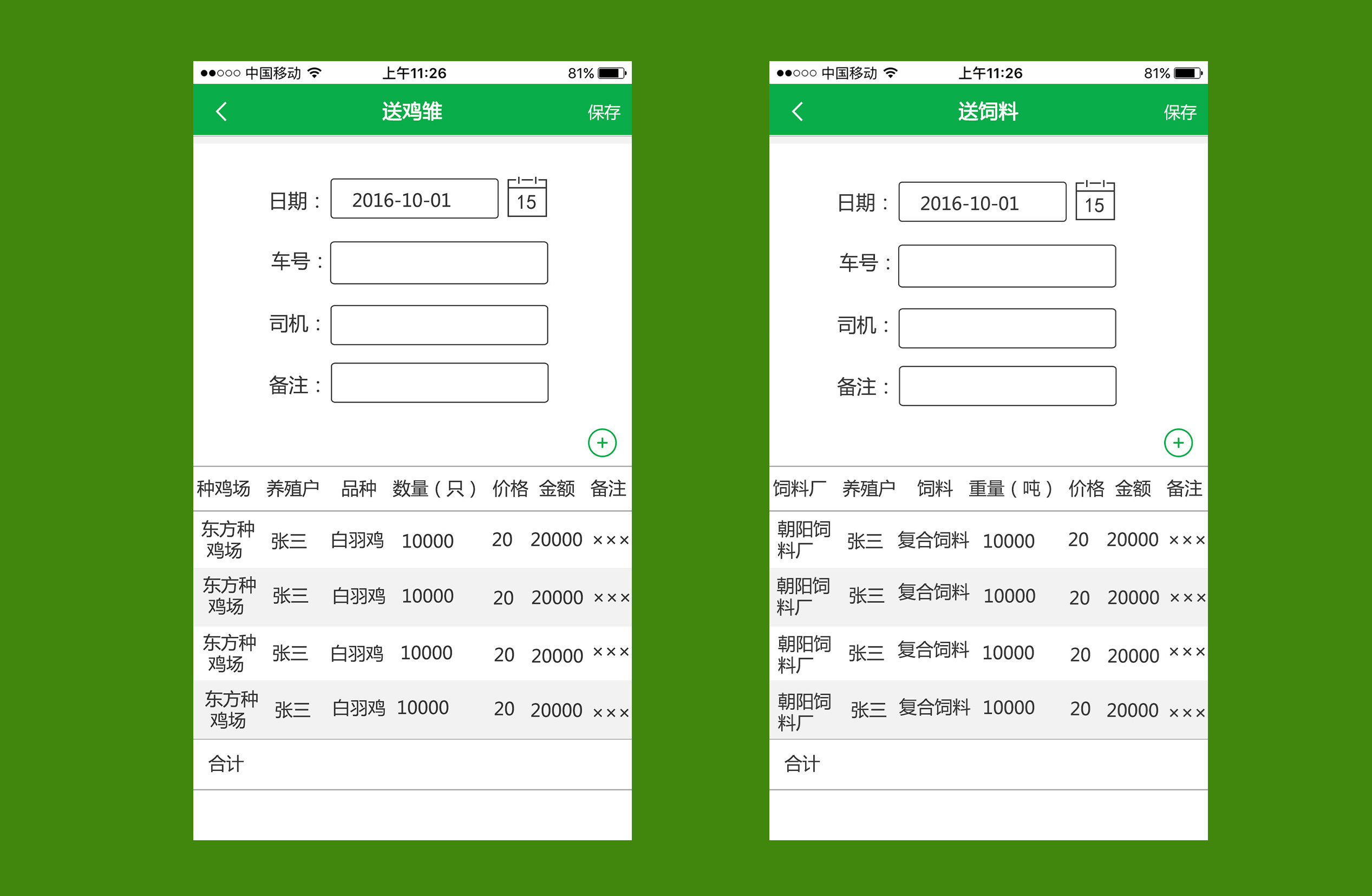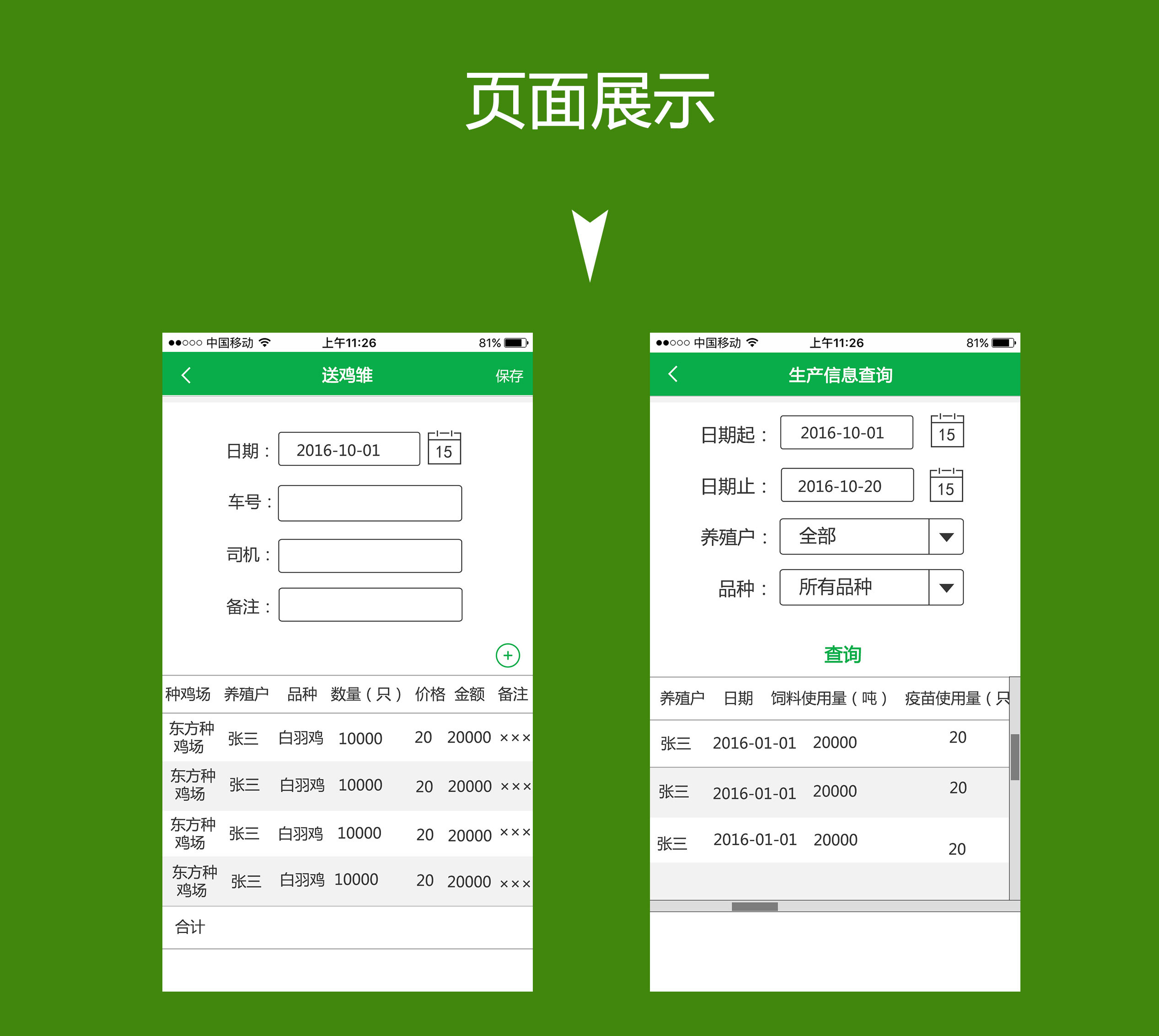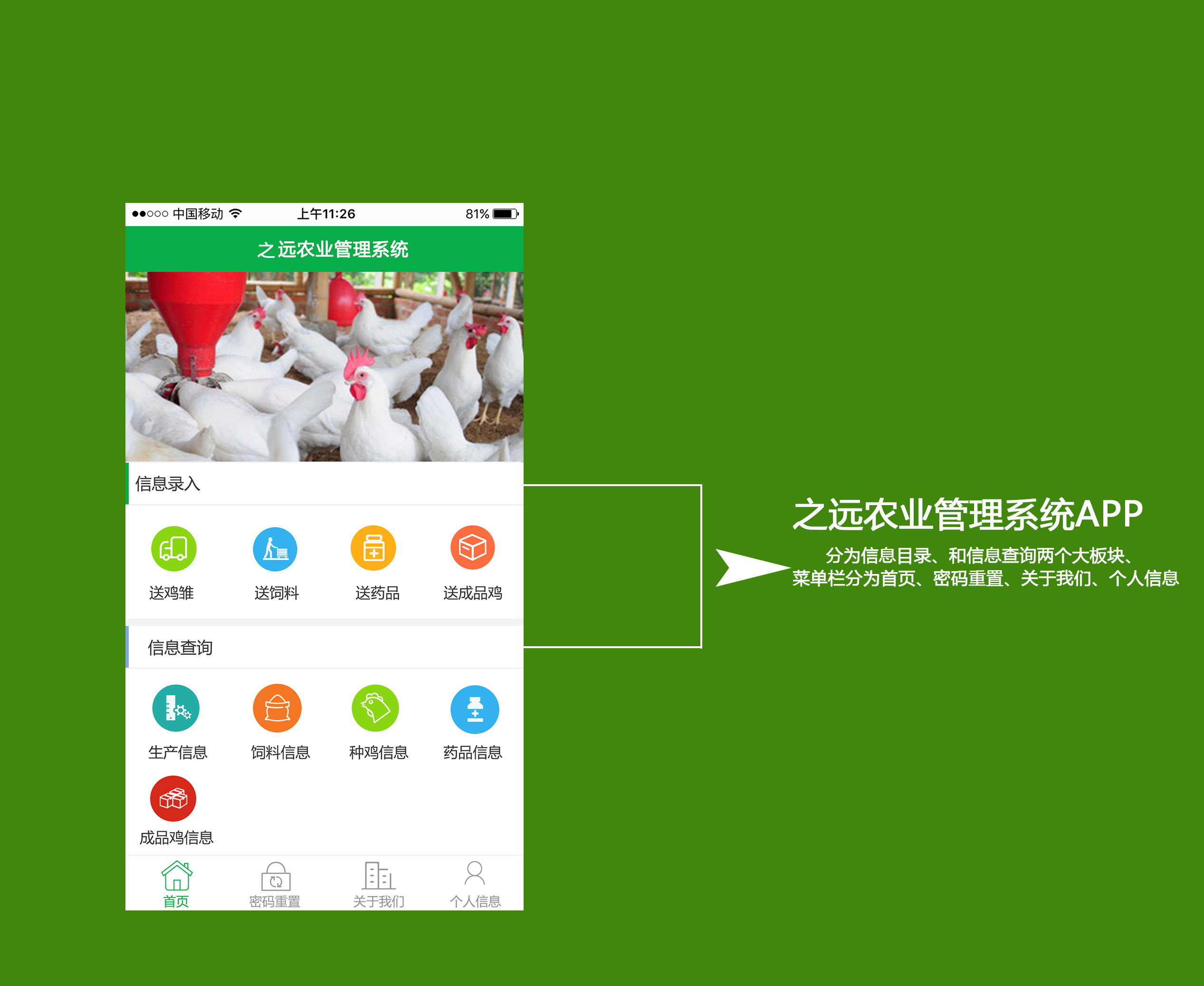 设计理念:之远农业管理系统APP包括信息录入与信息查询2大模块,包括雏鸡、饲料、药品和成品鸡管理功能。系统采用绿色基础色,强调天然、安全的行业特点。