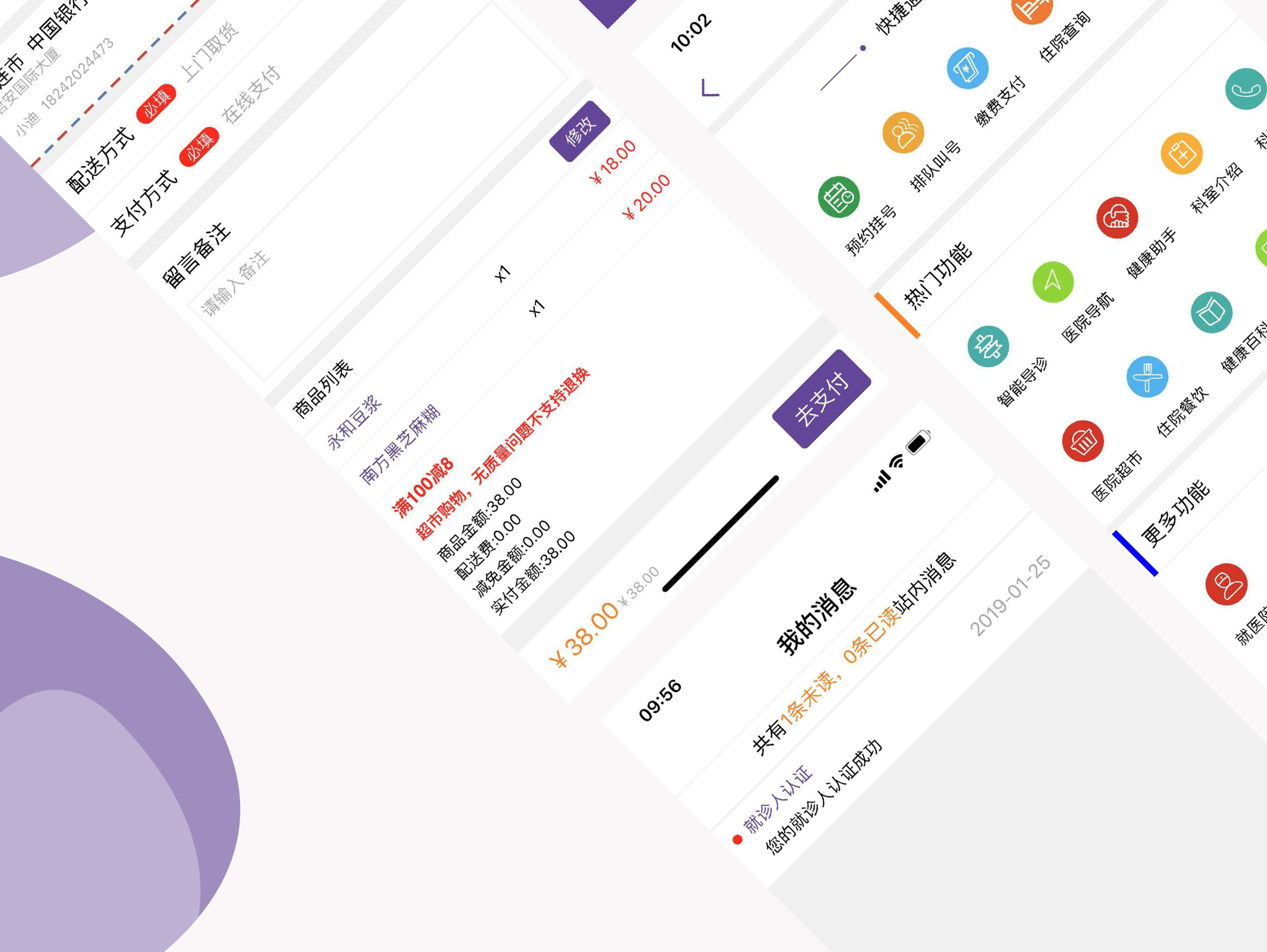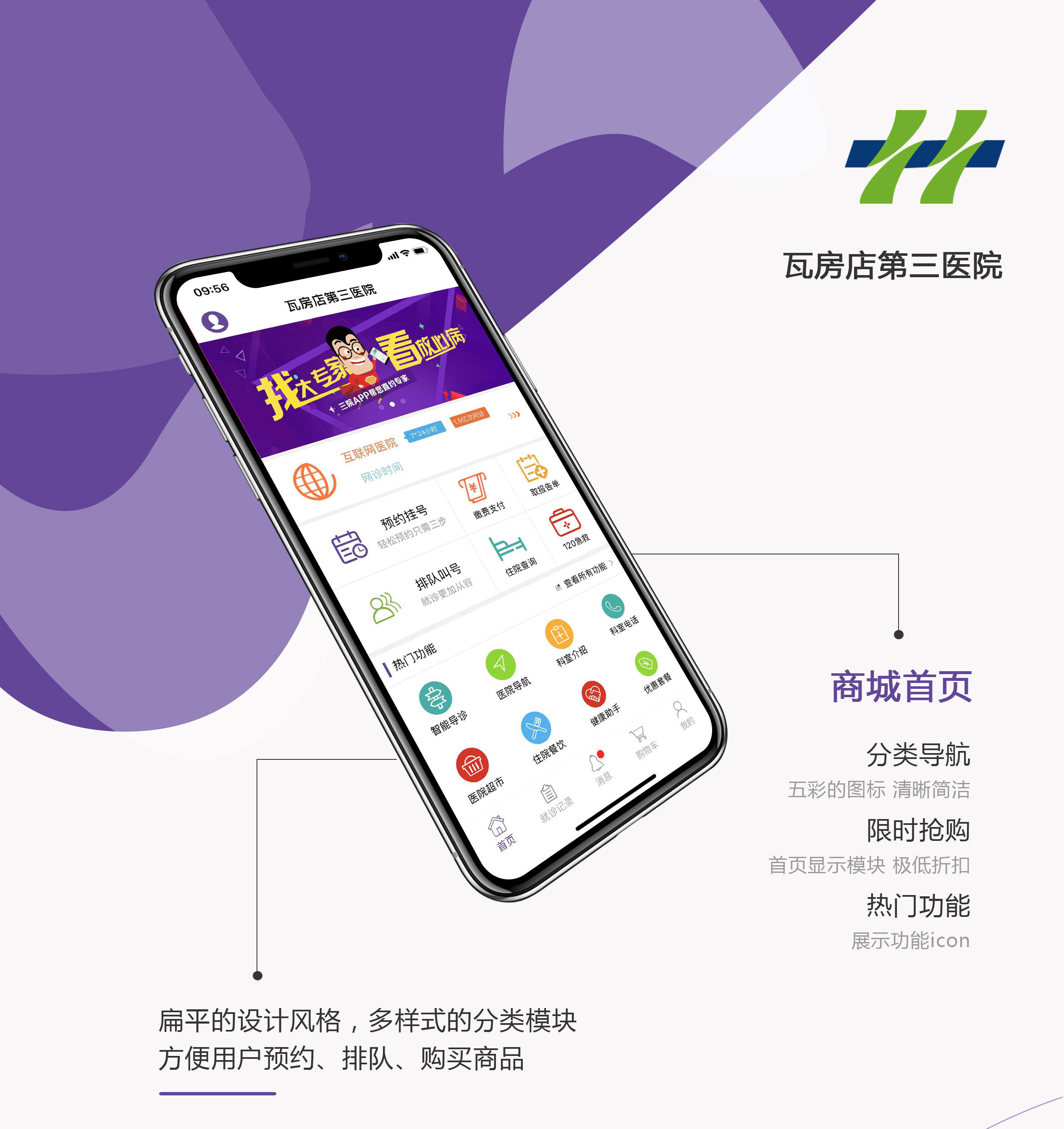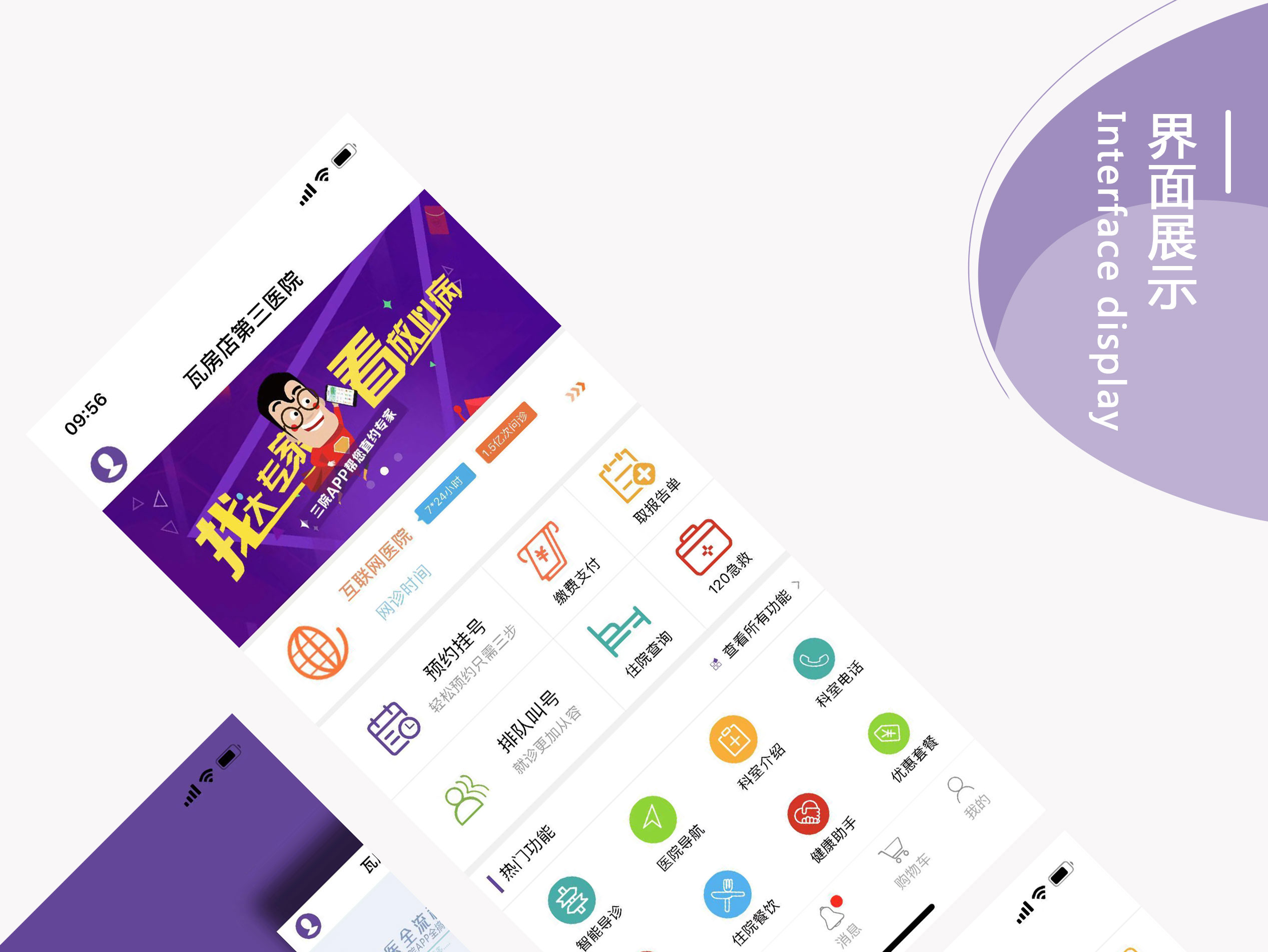 设计理念:瓦三医院app,多种分类模块:包括预约挂号、缴费等多种功能,内容丰富清晰。