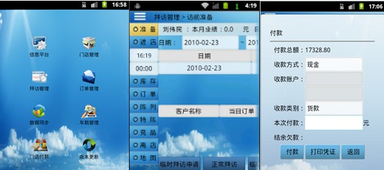 订单信息管理:销售人员可进行新增、查询、修改、删除订单操作;也可对门店进行收款,及时记录付款信息;当销售人员自行送货前,还可以对所有车载货物进行扫描和拍照,以备查询。
