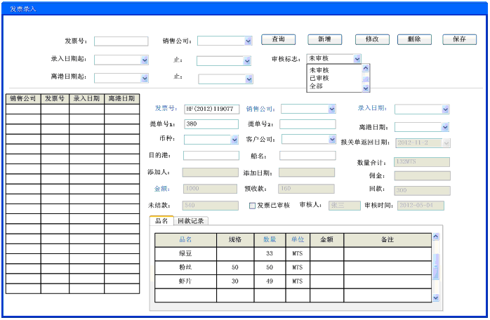 6、查询条件中的未审核,指的是,表头未审核或回款记录未审核。